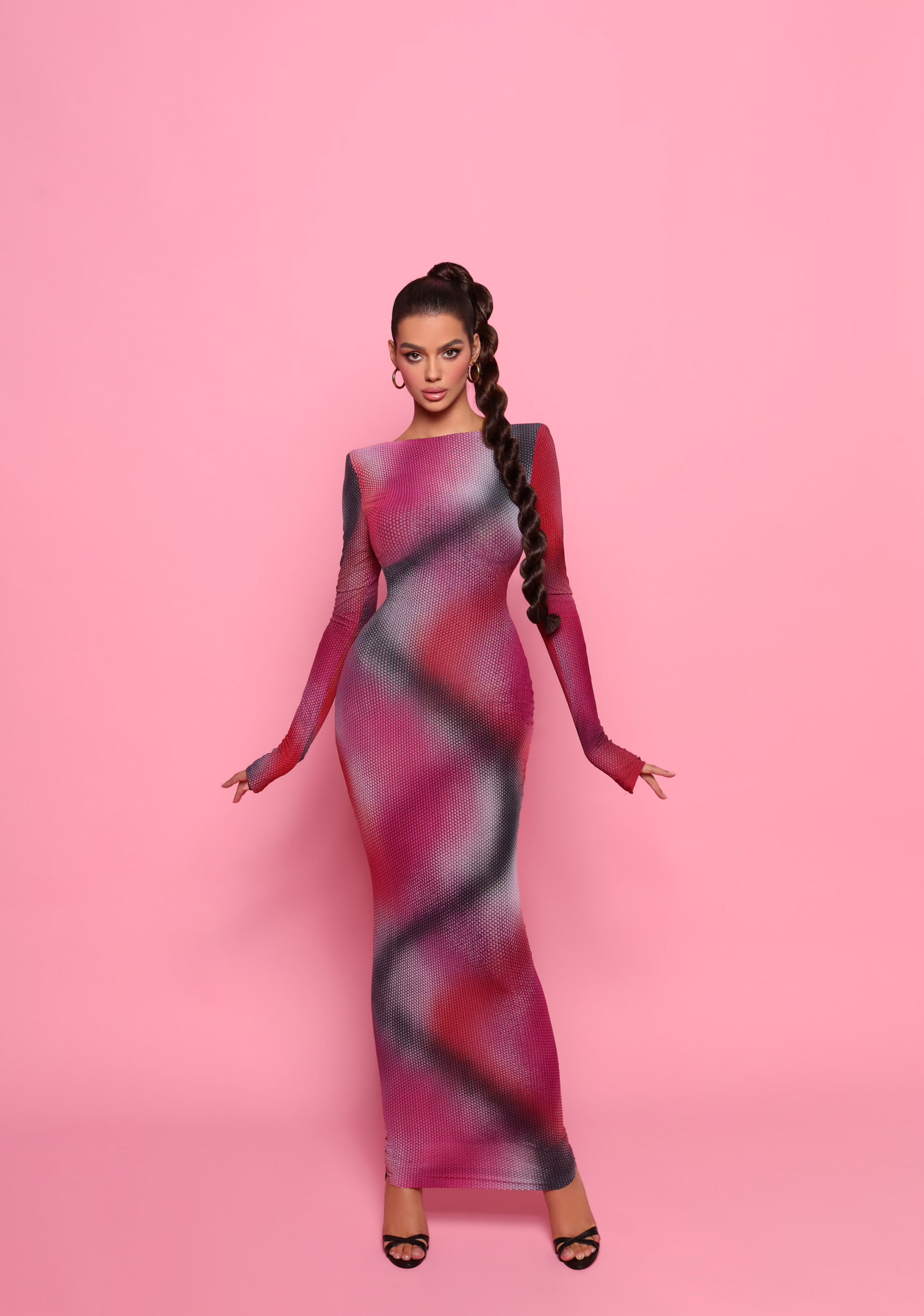 Long sleeve open back maxi dress in colorful print.