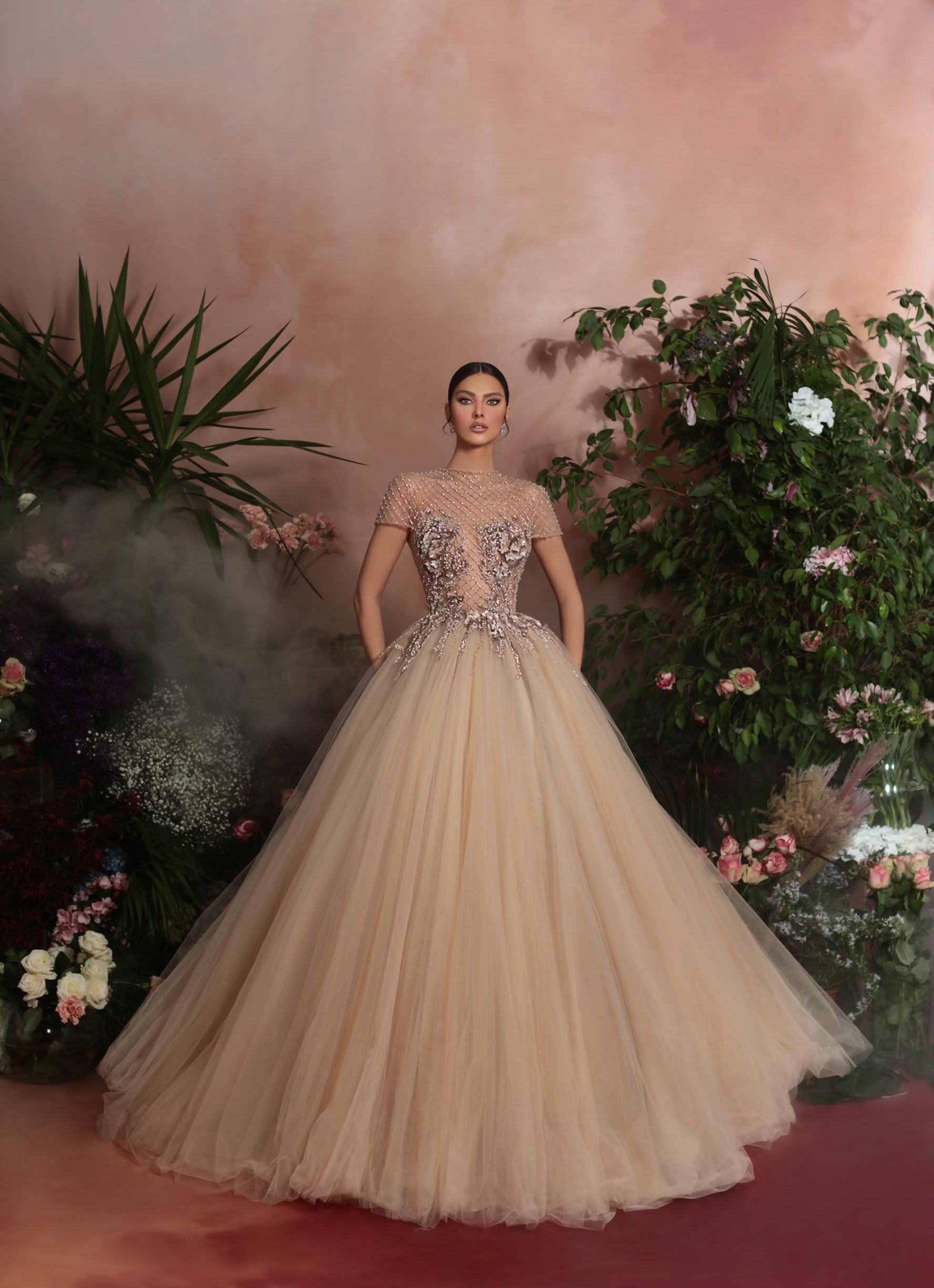 Nude tulle ball dress with crystal top and flower handmade details.