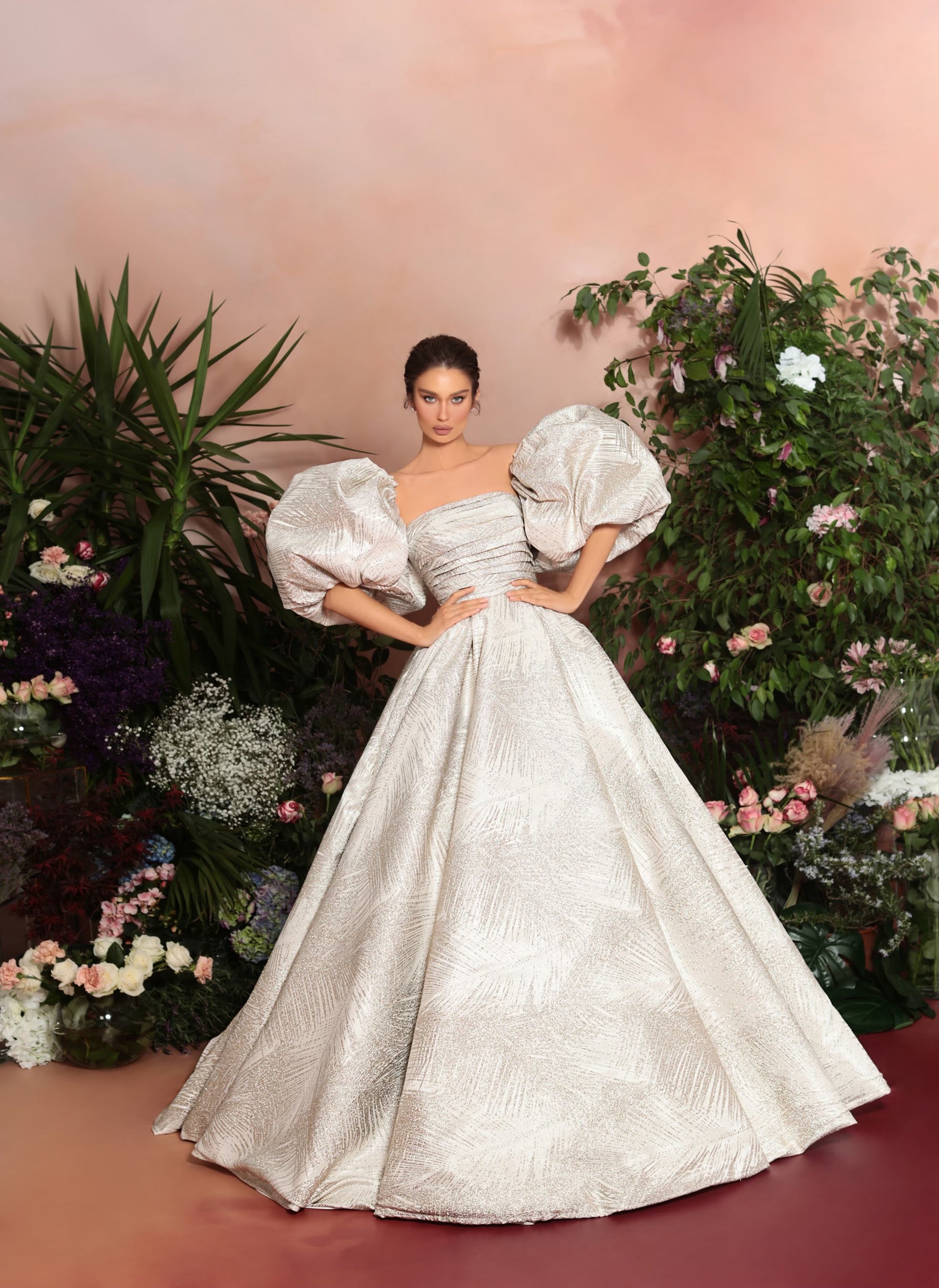 Ball dress with drapping corset and fluffy sleeves.
