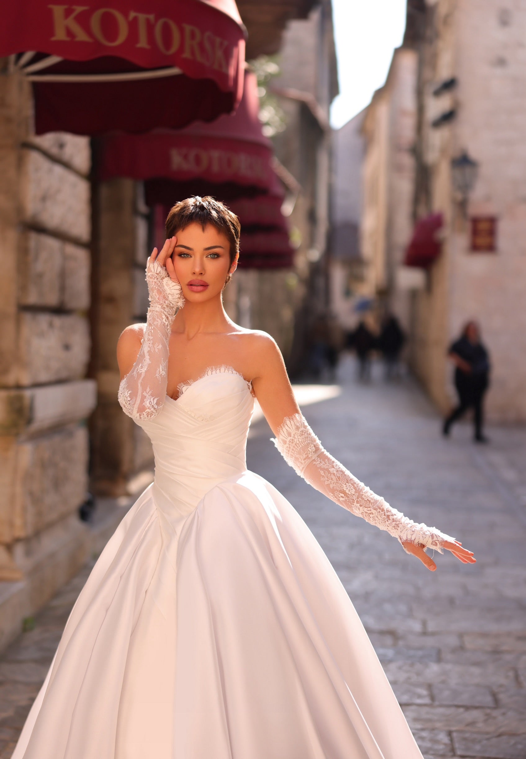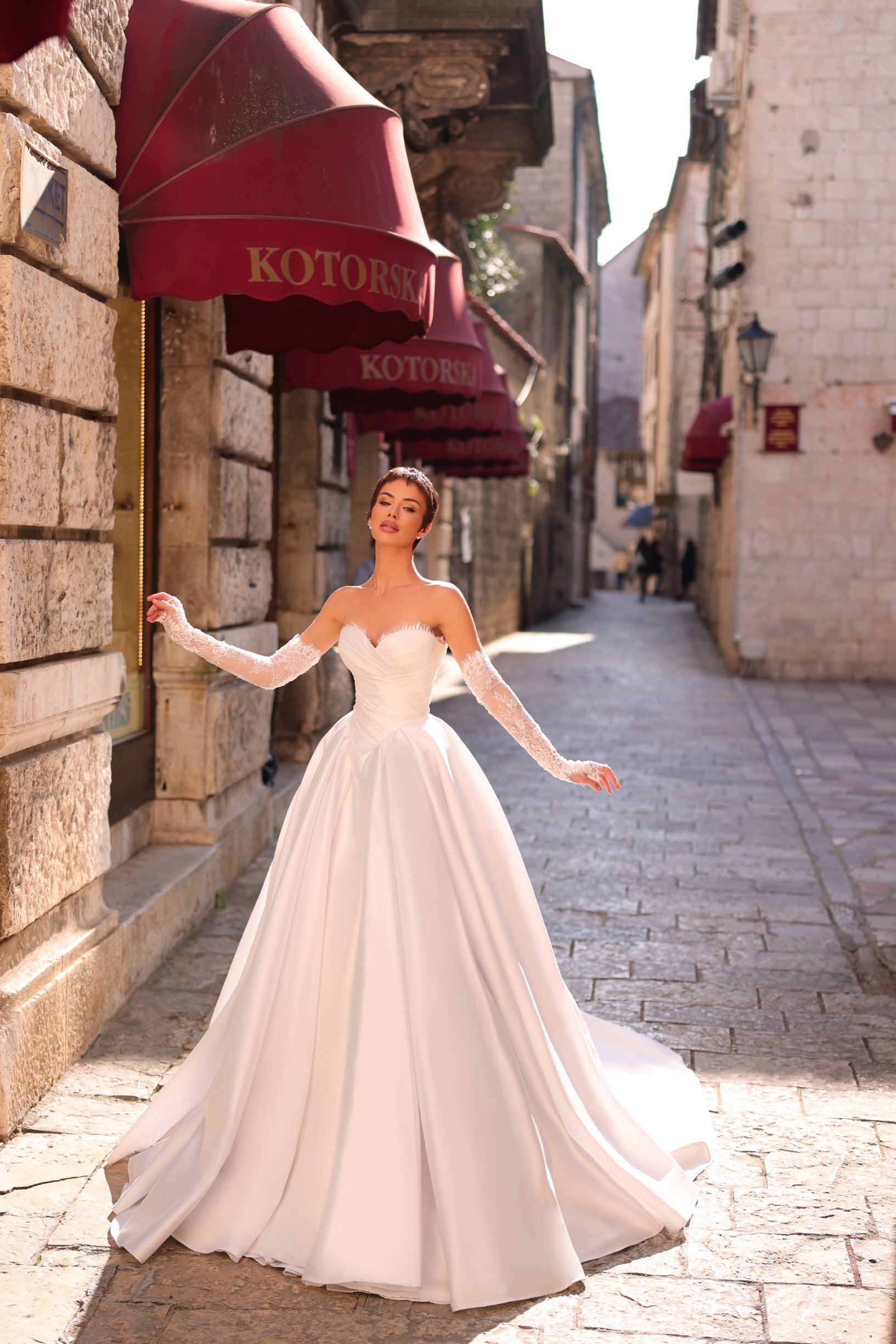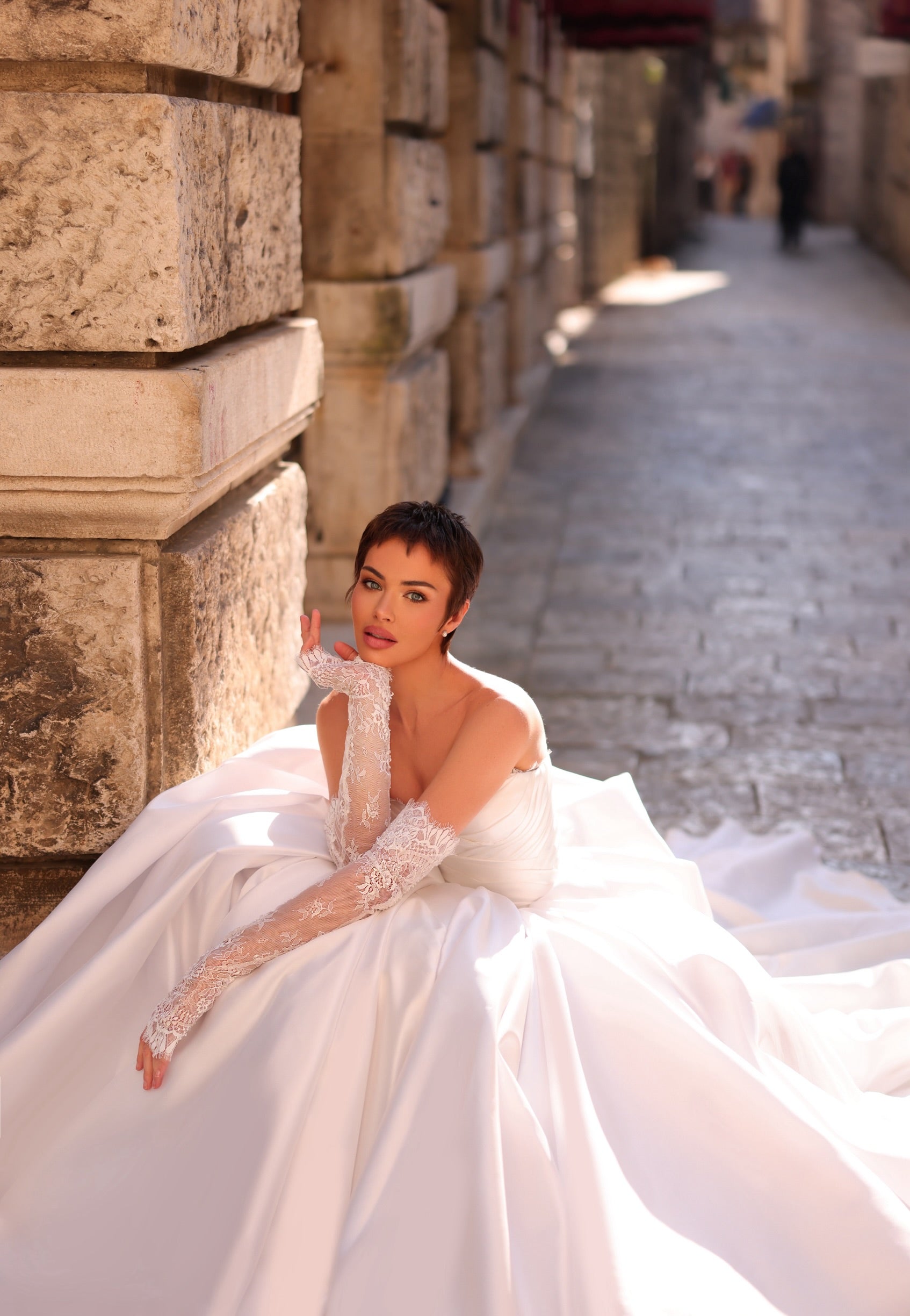 Step into a fairytale with the Belle wedding dress, a breathtaking gown designed for the modern princess. This regal masterpiece features a romantic sweetheart neckline, accentuated by a voluminous ballgown skirt that flows with graceful elegance. The structured bodice highlights your silhouette, while detachable lace gloves add a touch of vintage charm and sophistication.