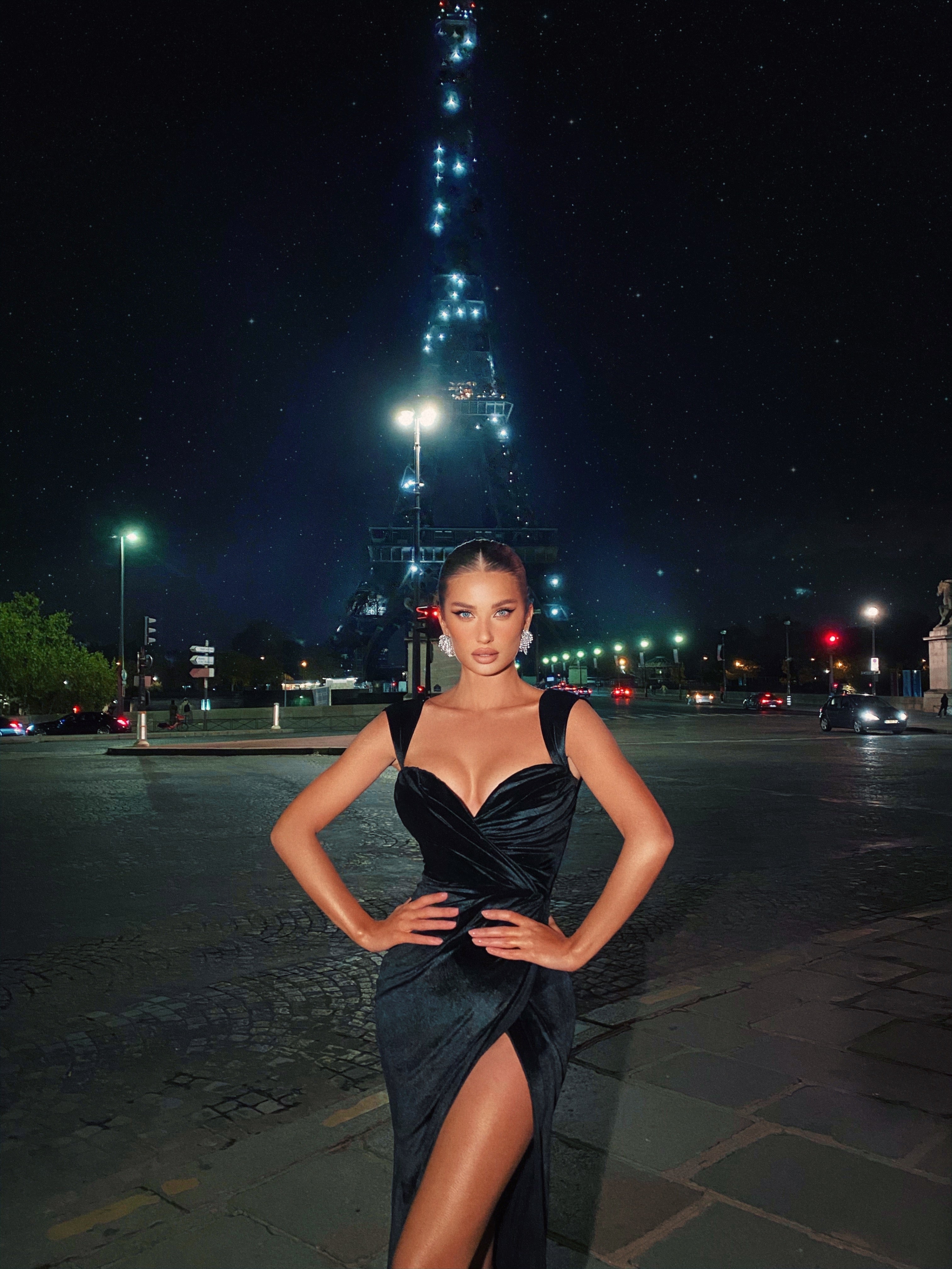Timeless black less-sleeves corset with drapping detail, long dress and high slit.