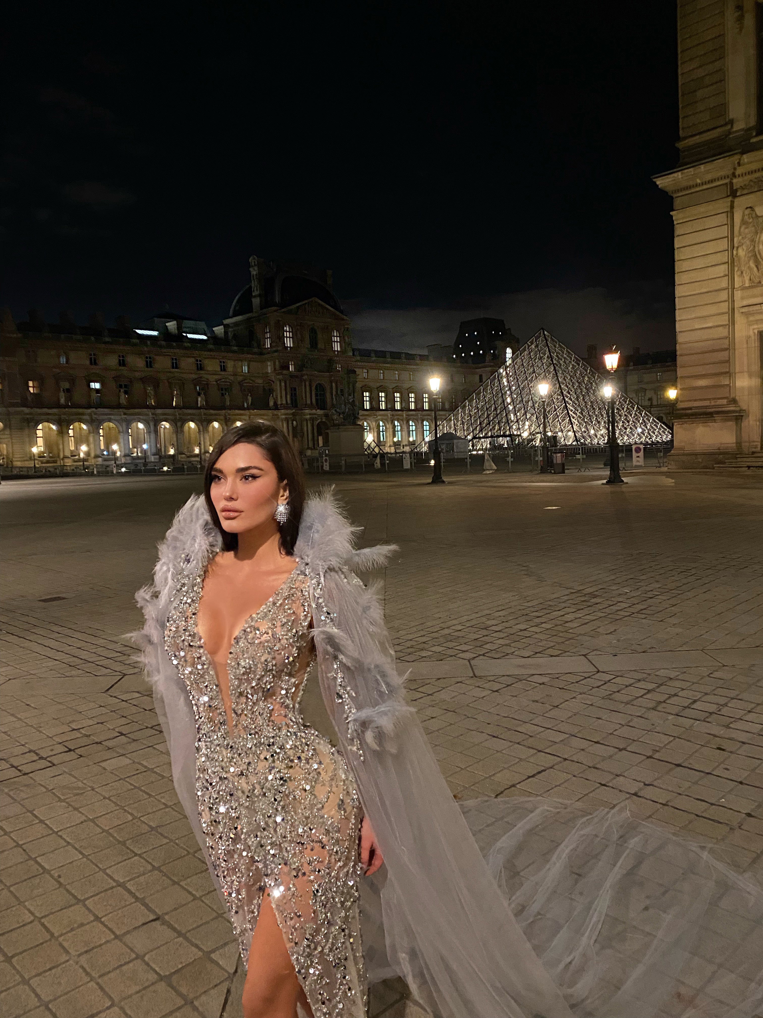 Shining silver fly-away gown, with embellished fabric and feather details.