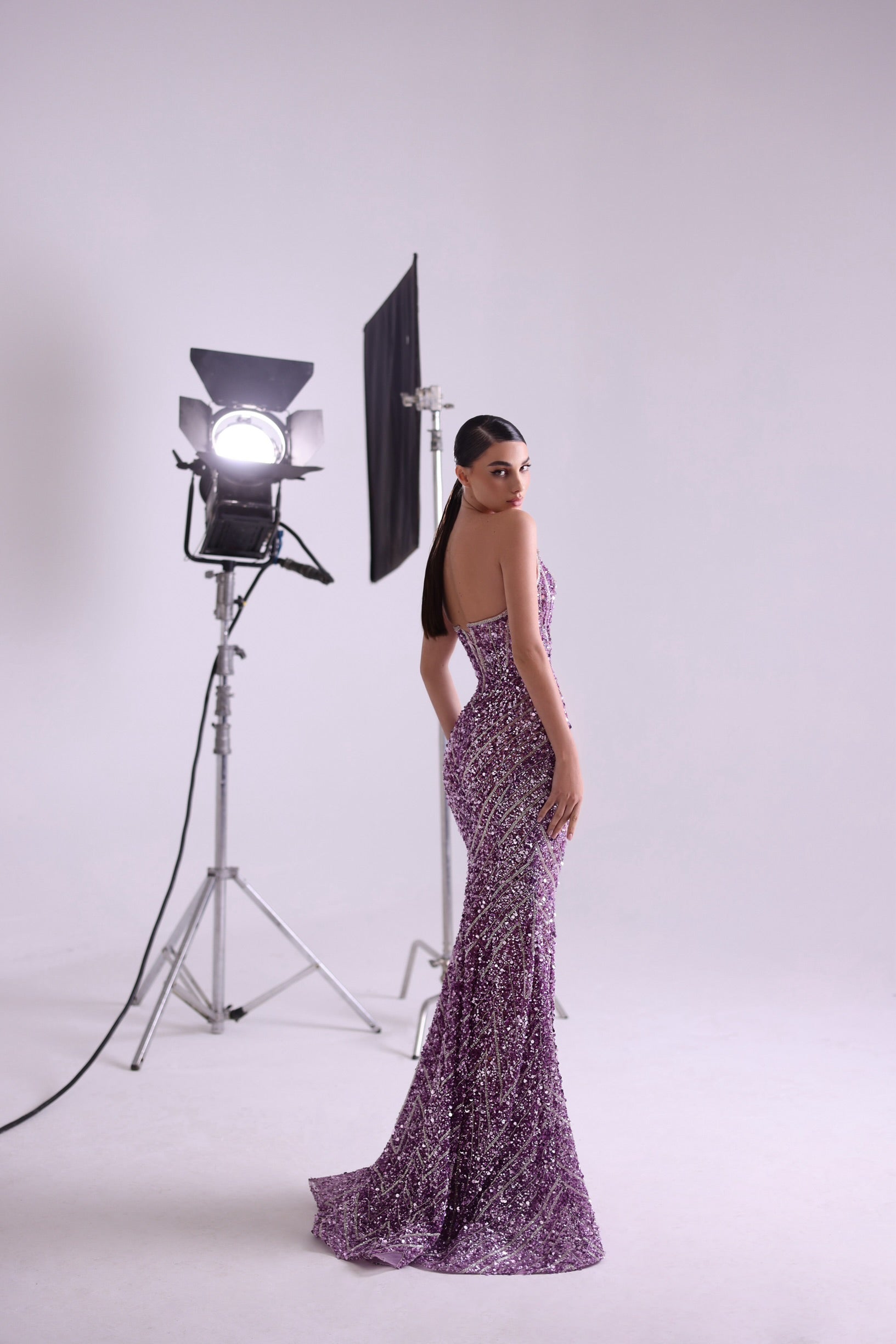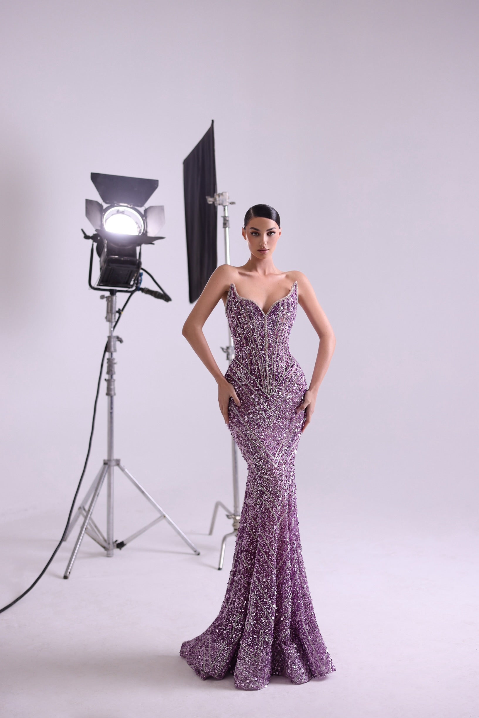 This stunning violet mermaid-style dress is crafted from fully embellished fabric, featuring a sleek and simple design. The corset bodice offers a structured, flattering fit, while details add texture and sophistication. The all-over embellishments enhance the dress’s elegant allure, creating a timeless, refined silhouette perfect for making a statement with minimal yet impactful design.
