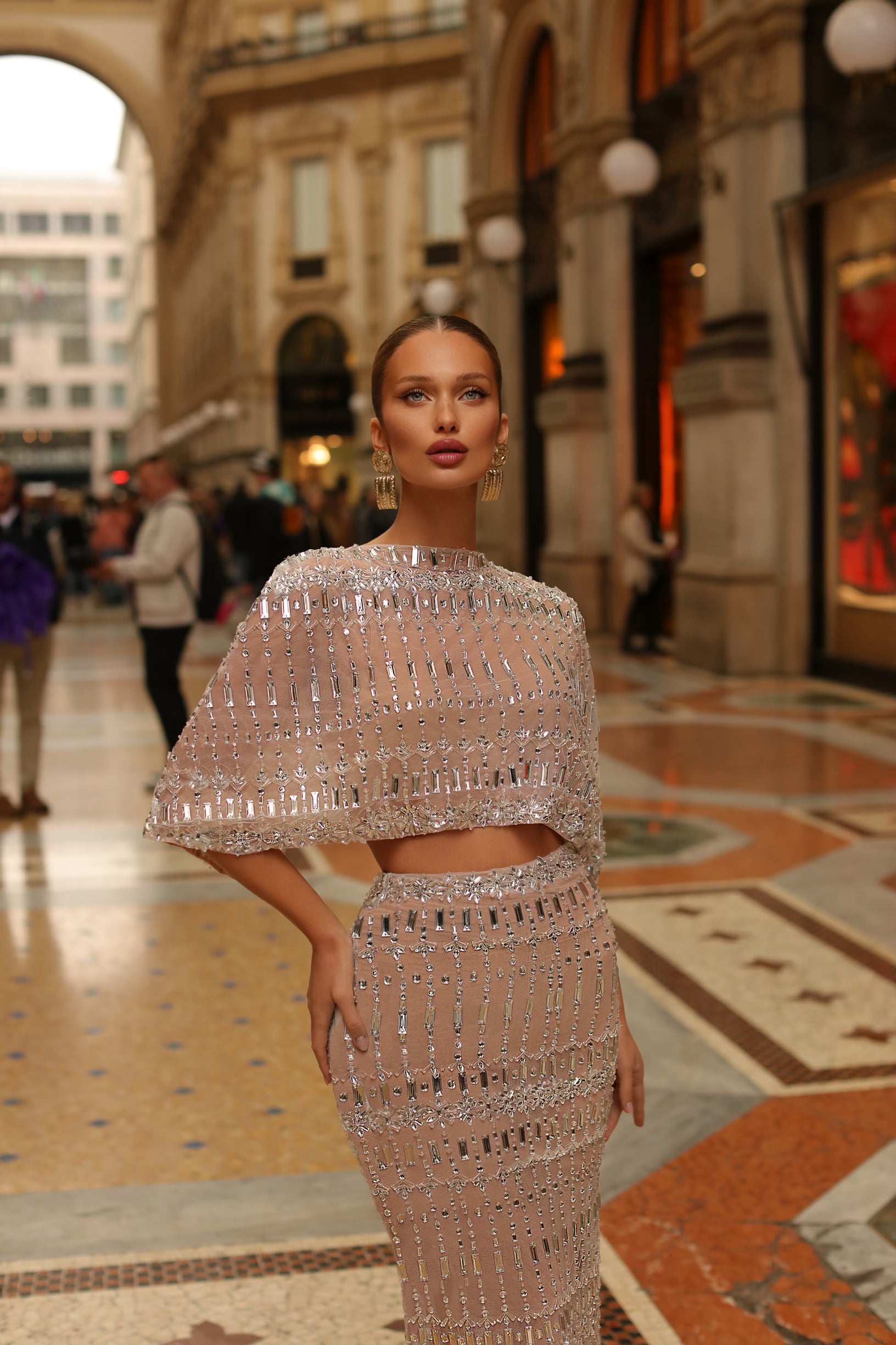 Fitted beaded two piece with open back.