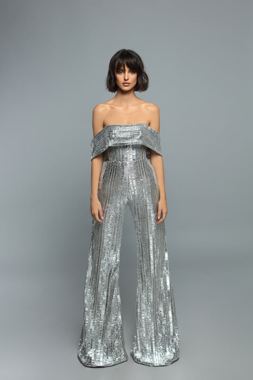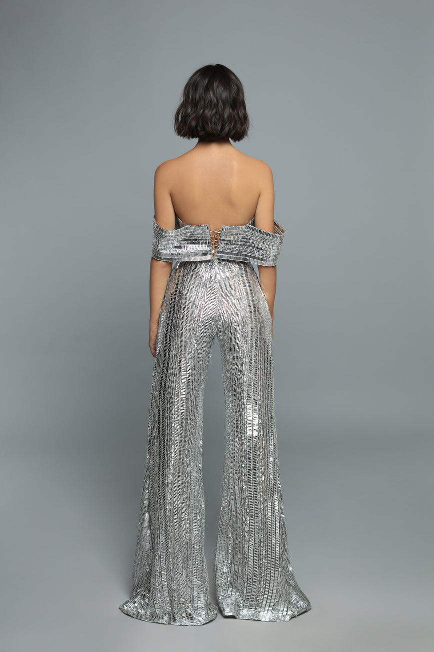 Elegant silver off sholder metallic jumpsuit.