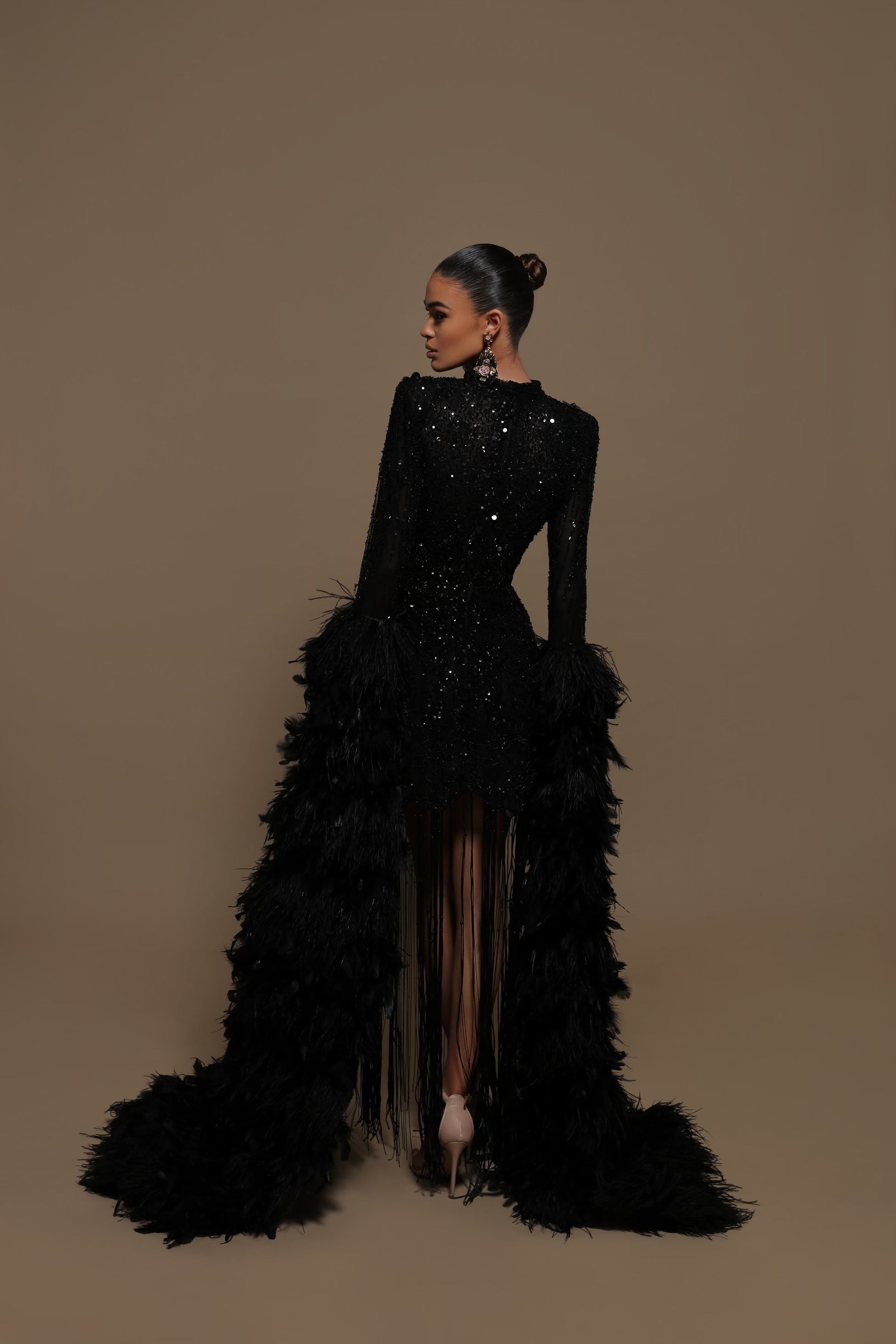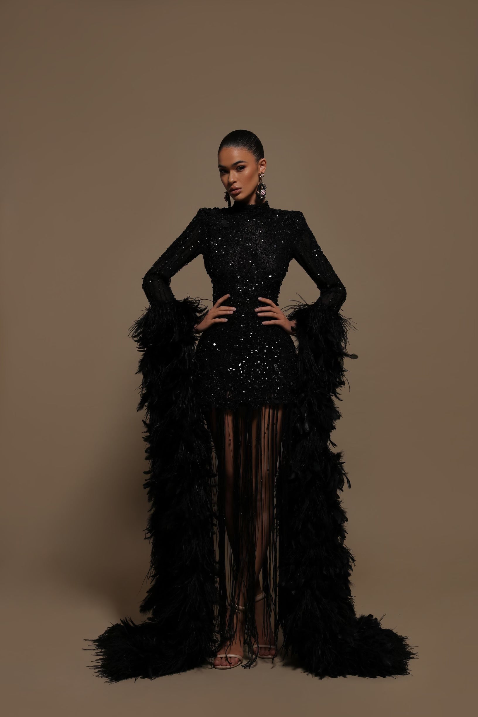 Sequin mini dress in black with turtleneck, long sleeve feather, fringe hem.