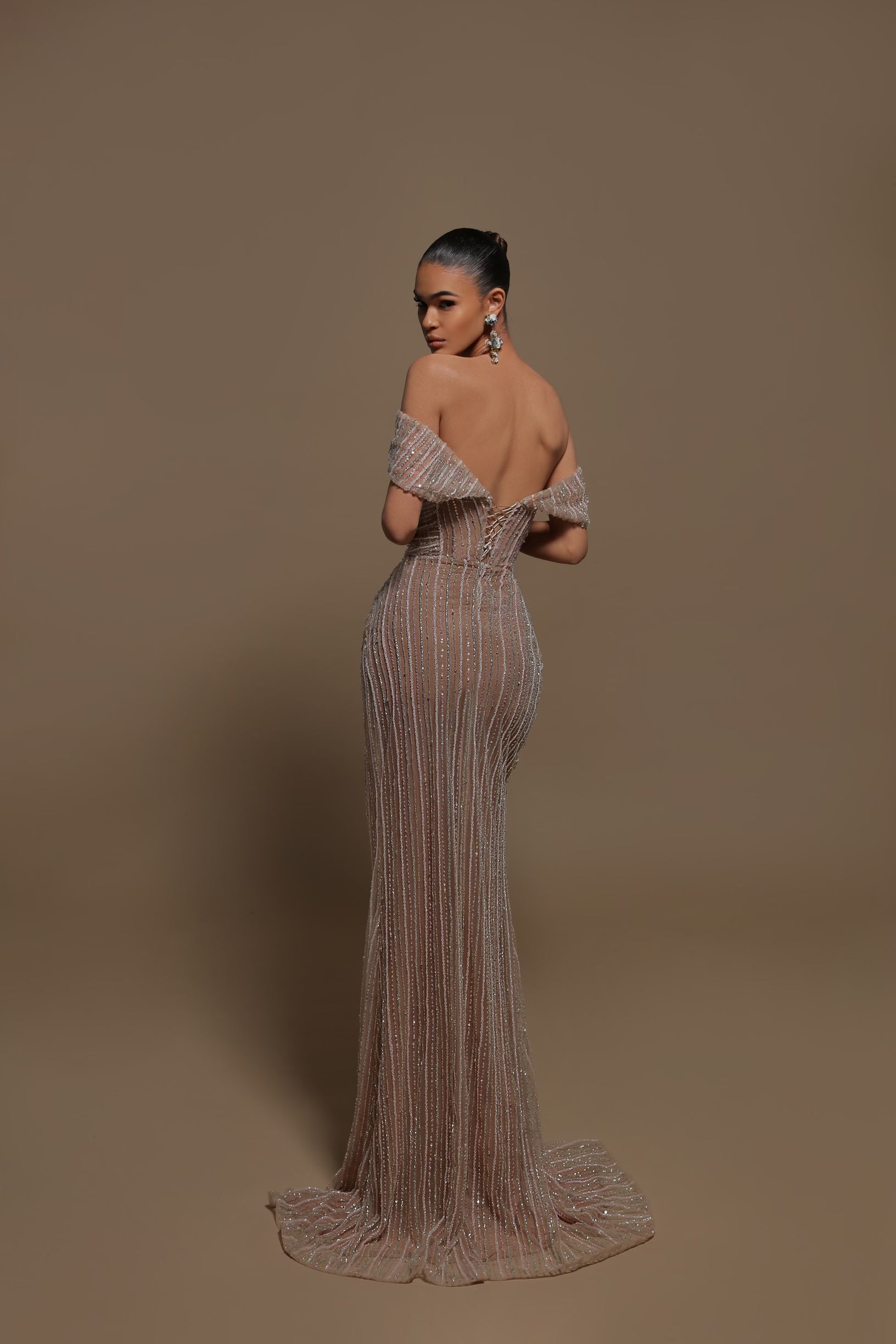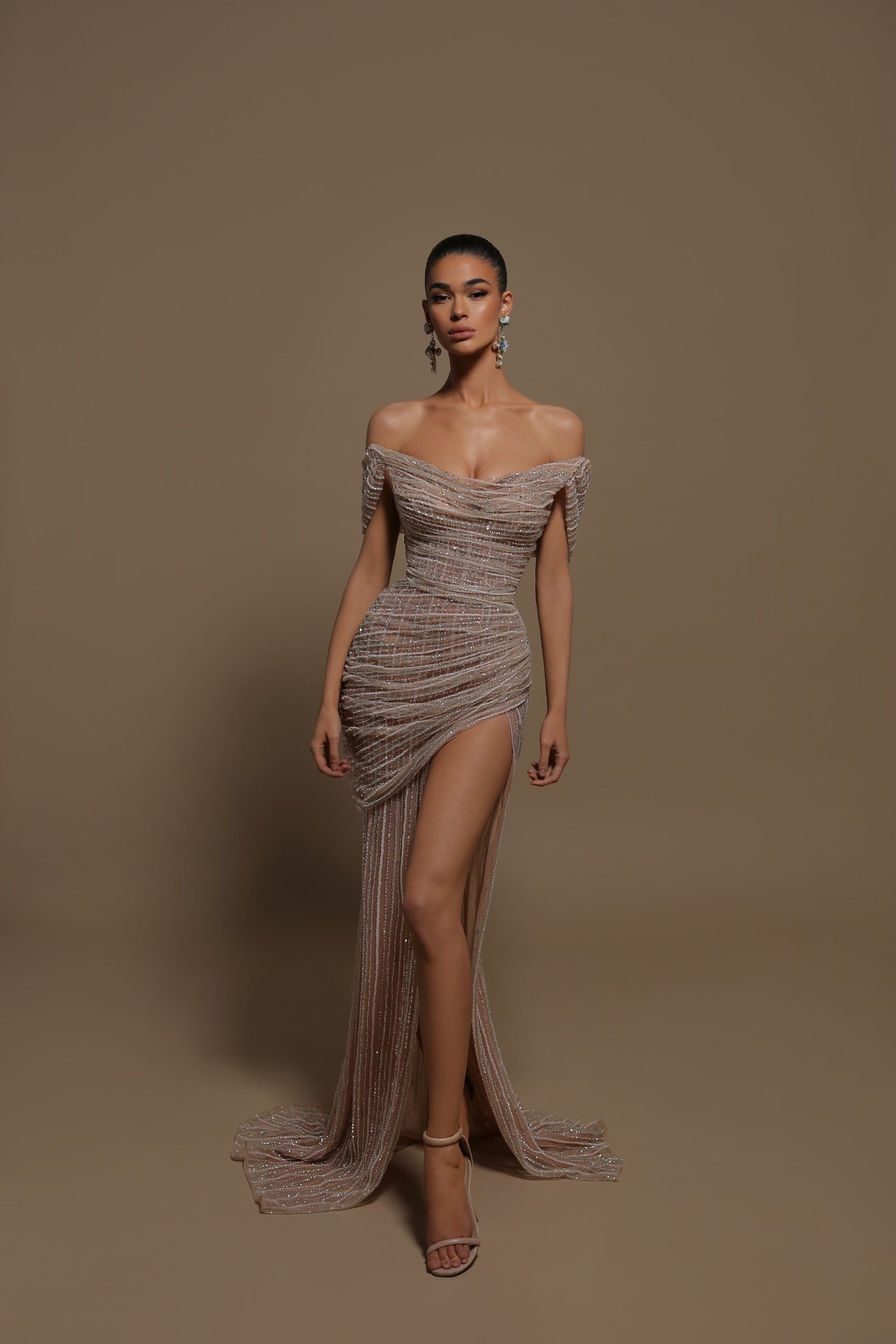 Maxi dress off shoulder, ruched waist and high slit.