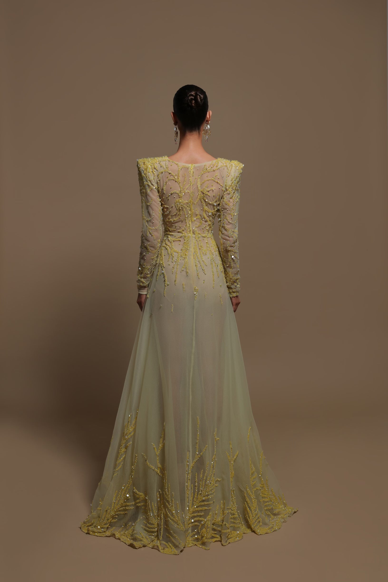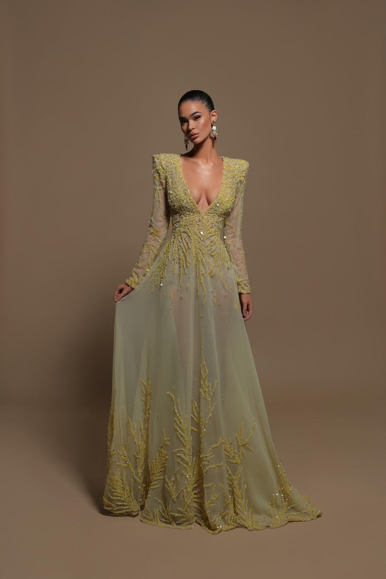 Evening dress with V-neckline, long sleeve embellished and shoulder pad.