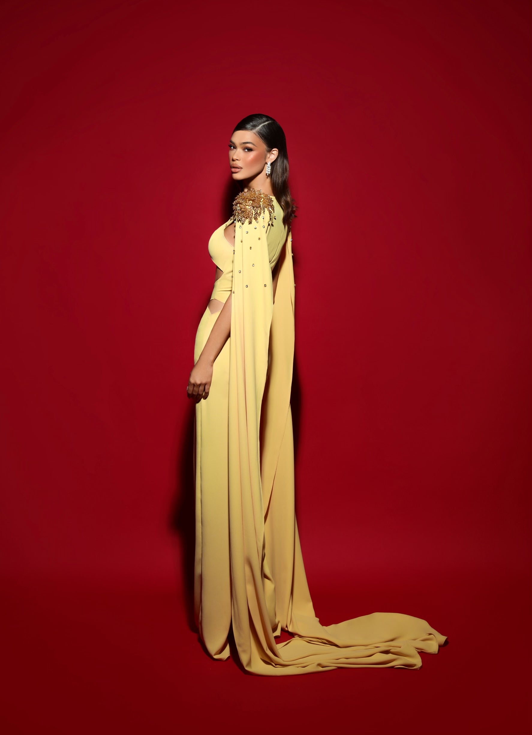 Georgette crepe dress in yellow with long sleeve, open abdomen and details on shoulder.