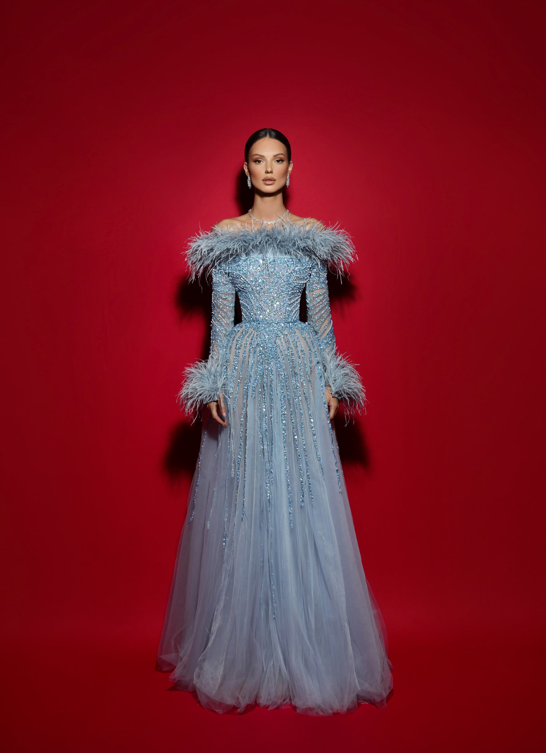 Evening dress in baby blue with feather off the shoulder and sleeve.