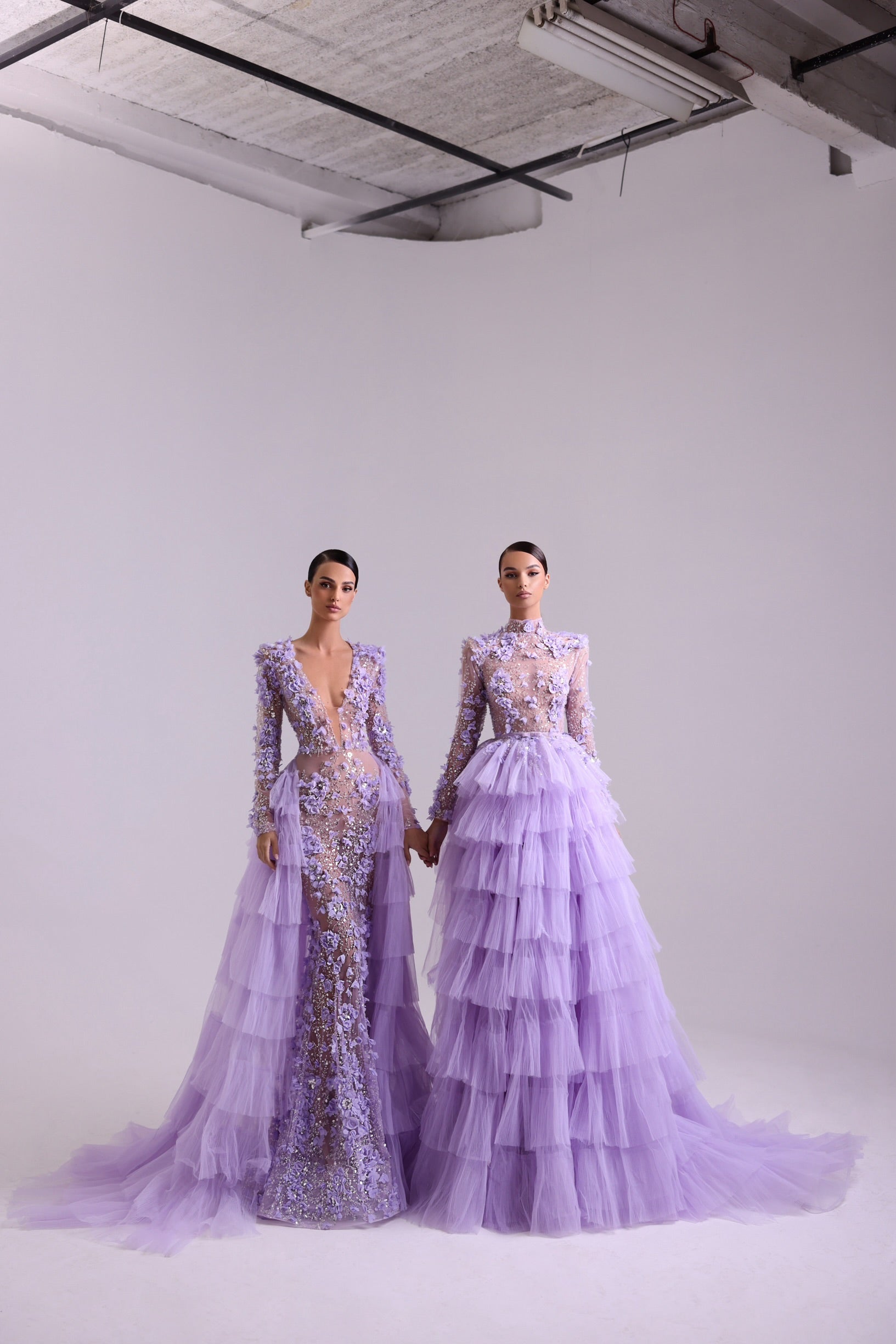 This soft lavender gown is a masterpiece of elegance, featuring intricate 3D floral appliqués and shimmering embellishments over a sheer silhouette. With a plunging neckline, long sleeves, and a detachable layered train, this gown is perfect for creating a statement at any grand event.