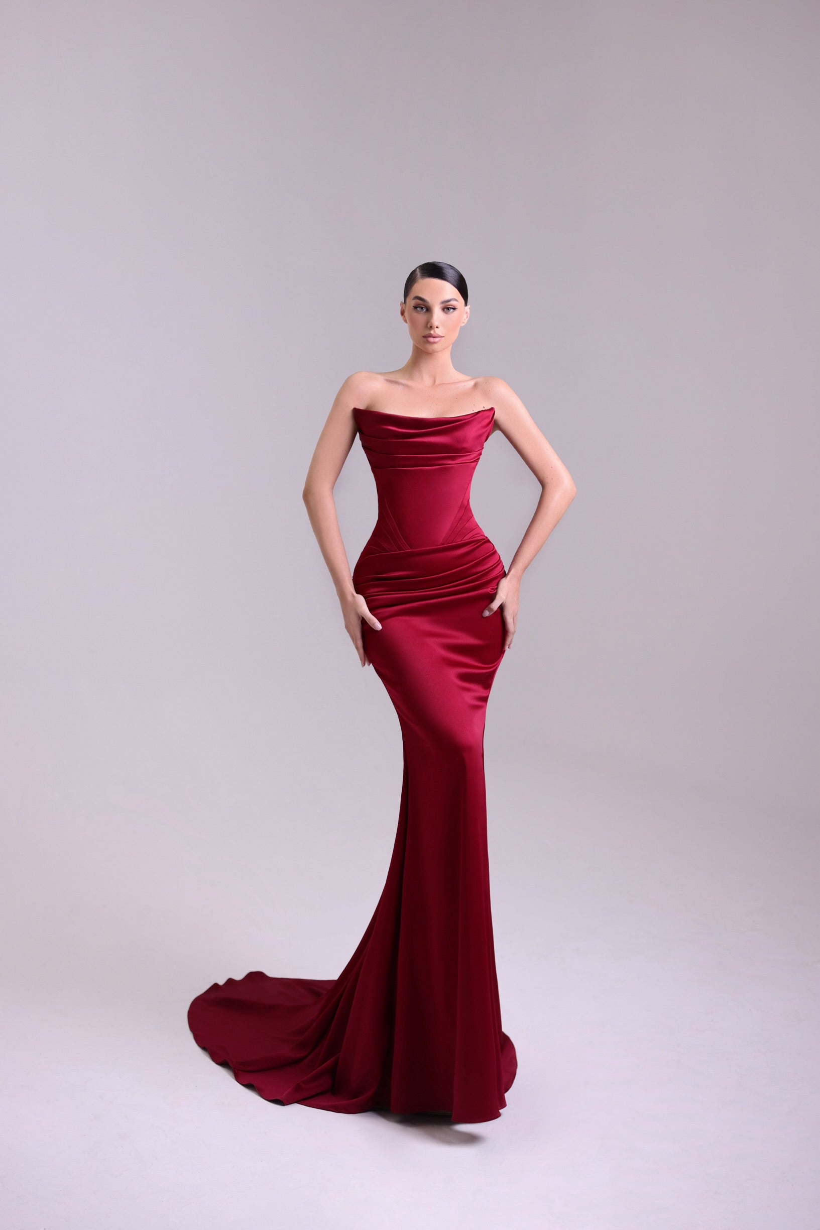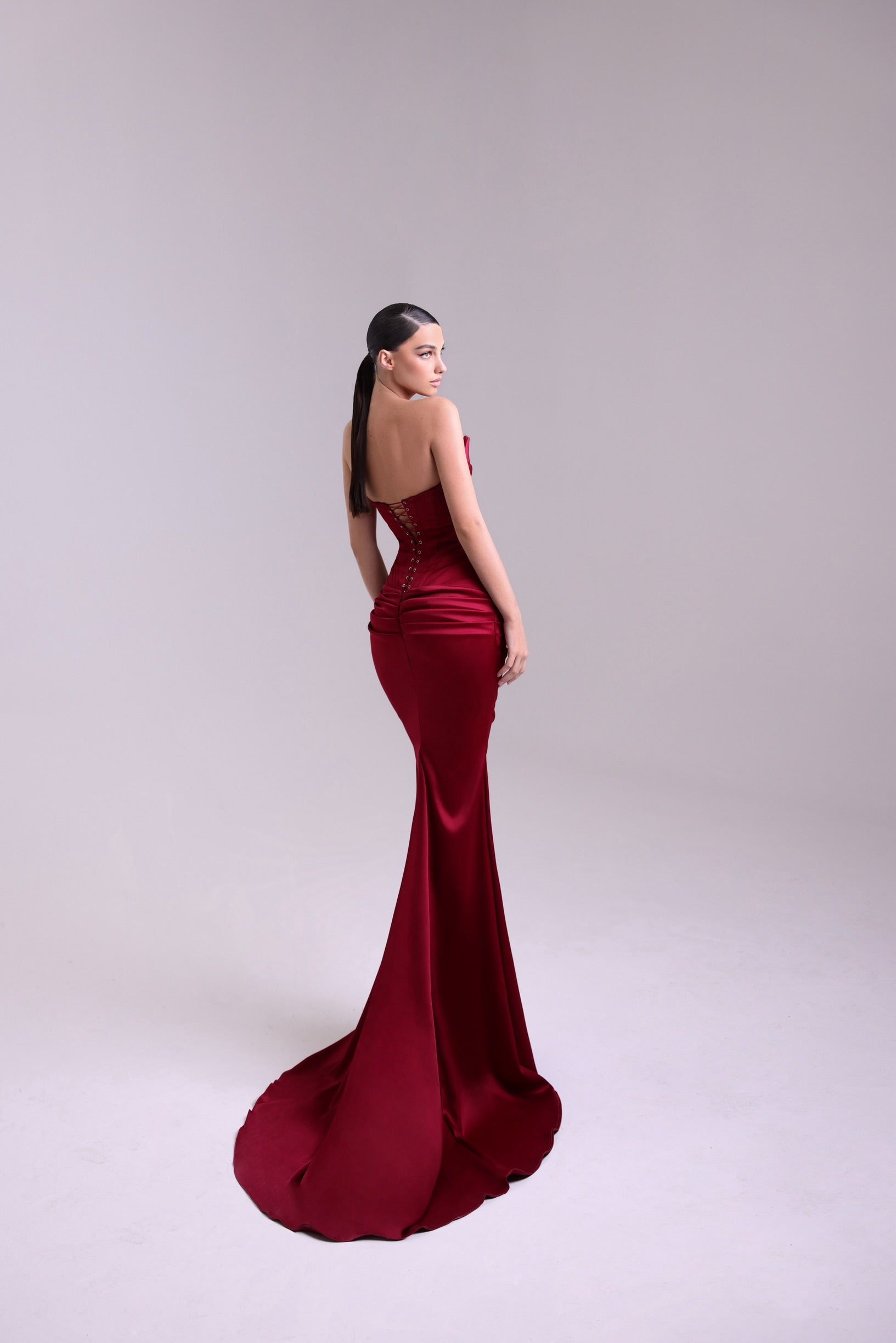 Rose dress - a breathtaking strapless gown crafted from rich crimson satin, featuring a draped cowl neckline, a structured corset bodice for a sculpted fit, and a sweeping mermaid train for timeless sophistication.