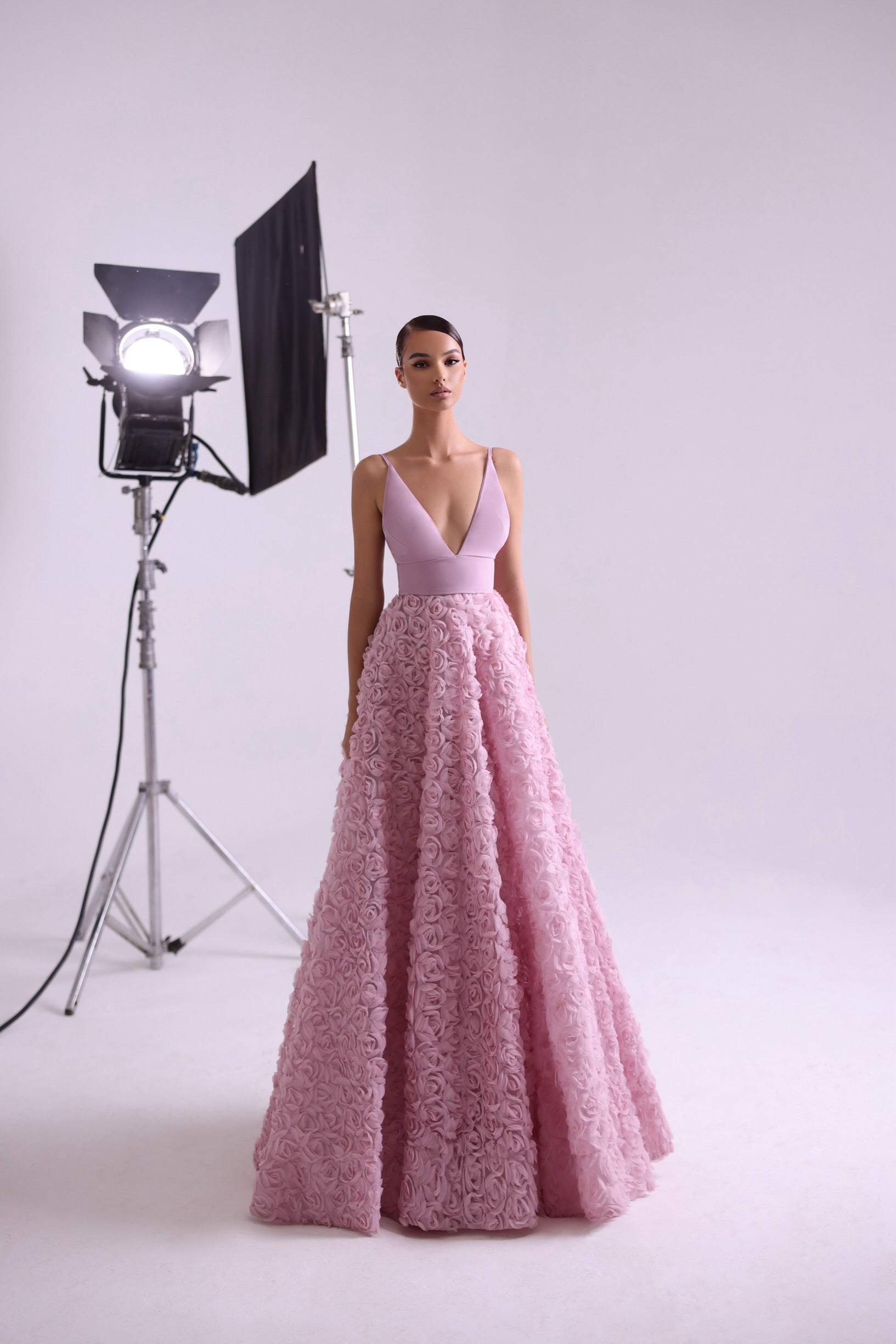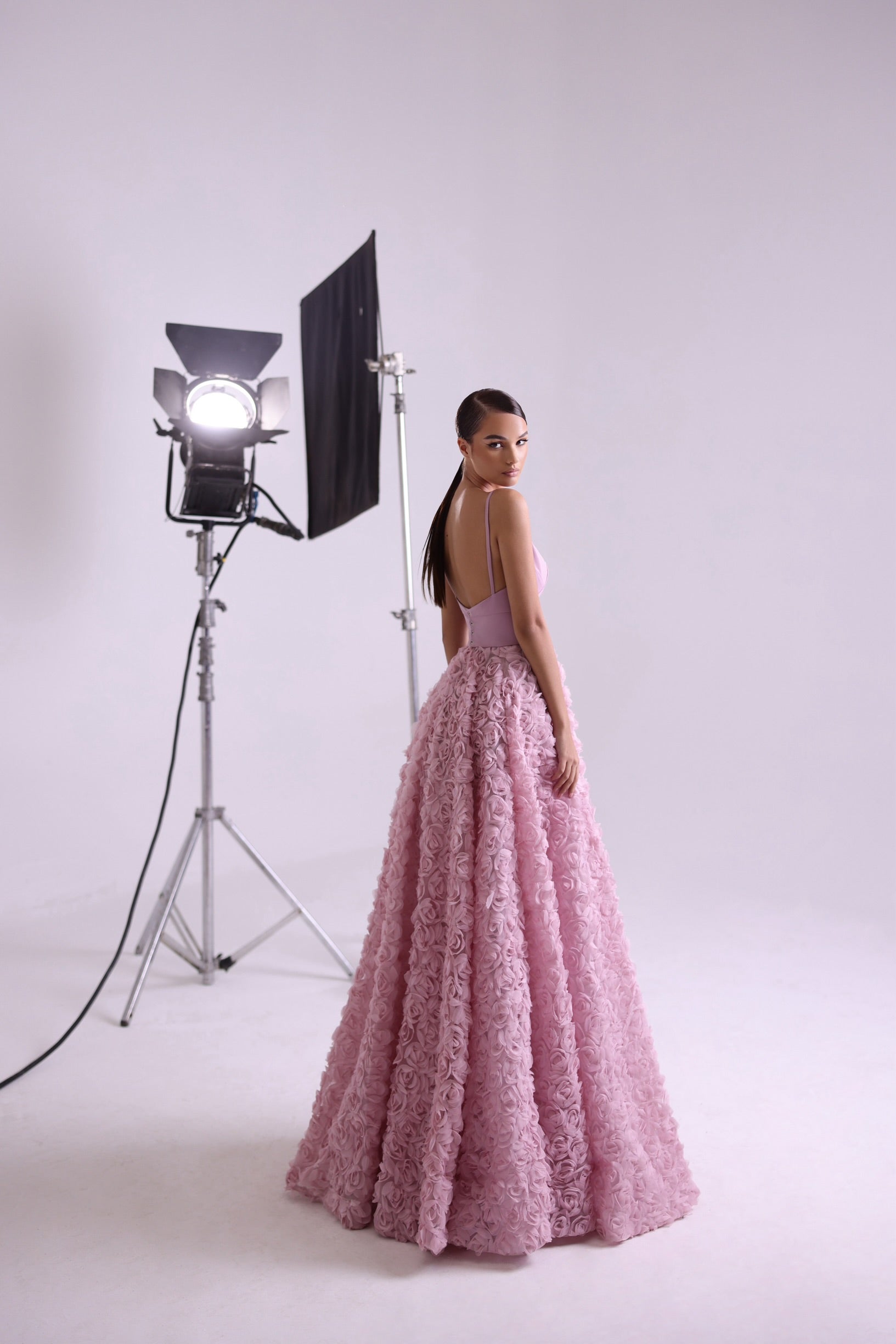 This elegant soft pink dress features delicate straps and a flattering A-line silhouette. The fabric is adorned with intricate rose patterns, adding texture and romantic detail to the design. The flow of the A-line skirt creates a graceful, timeless look, making this pink dress perfect for any special occasion.