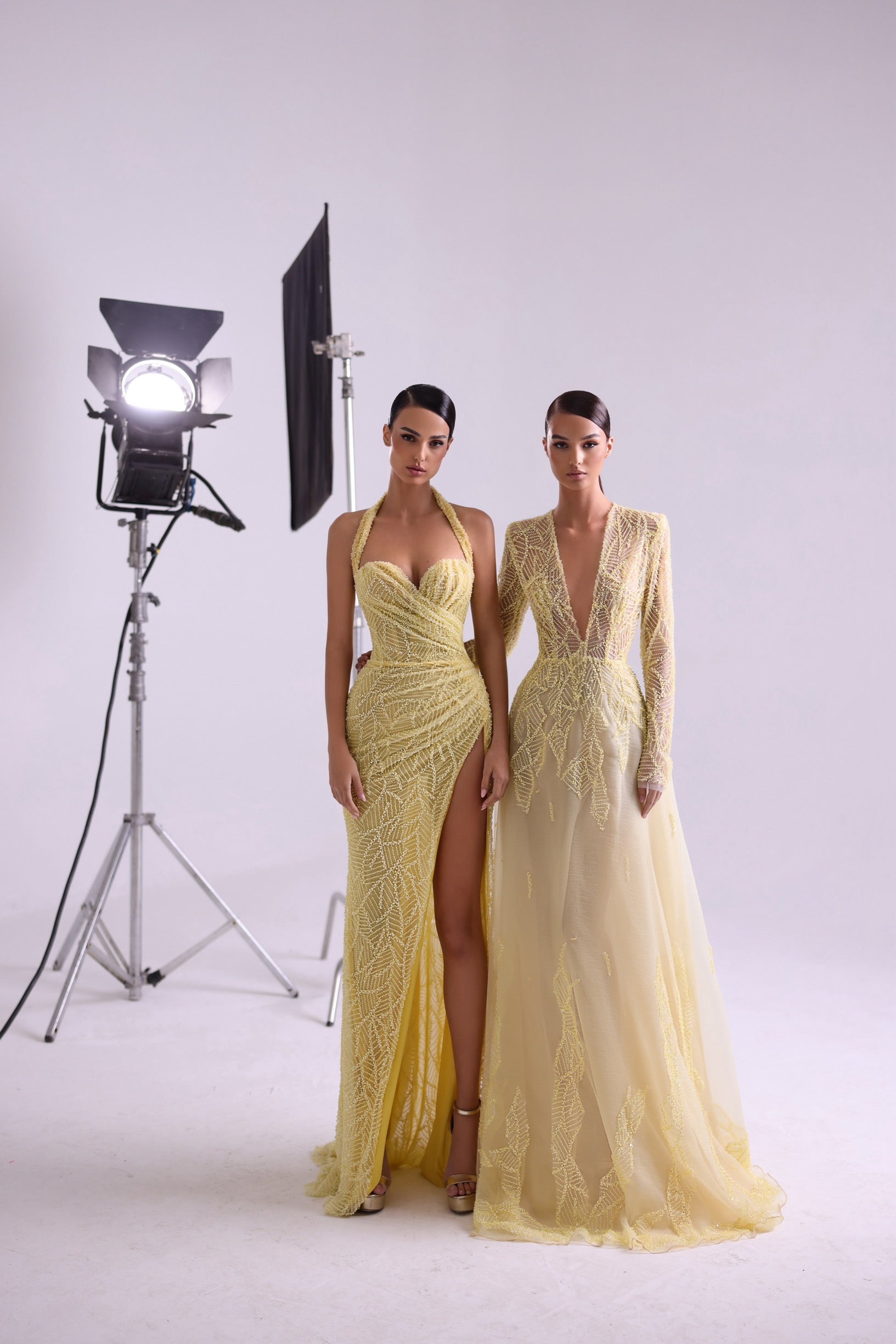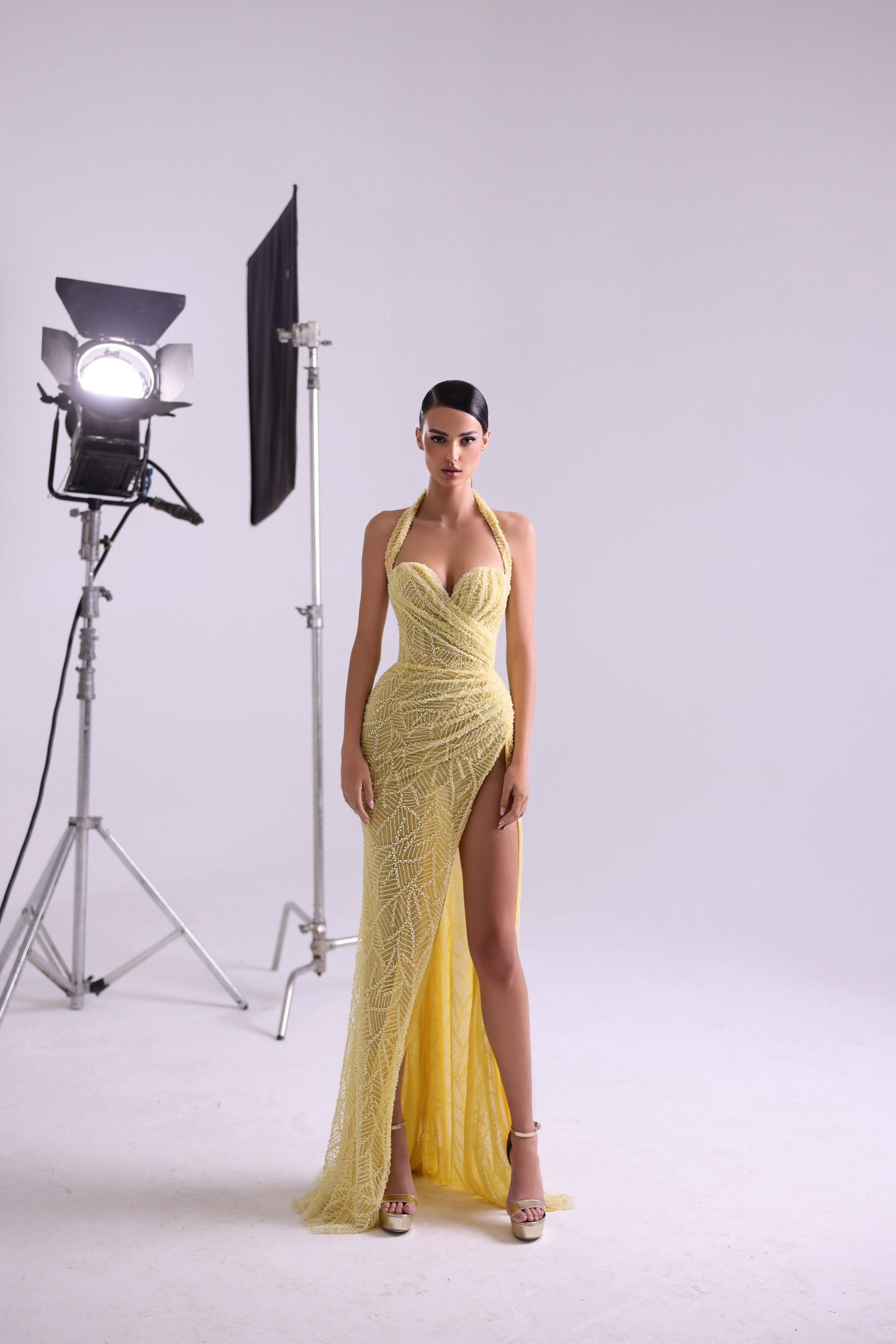 A radiant yellow gown that exudes confidence and allure. Featuring intricate beadwork, a figure-hugging silhouette, and a daring thigh-high slit, this dress is designed for bold entrances and unforgettable moments. Perfect for those who want to shine as bright as the sun.