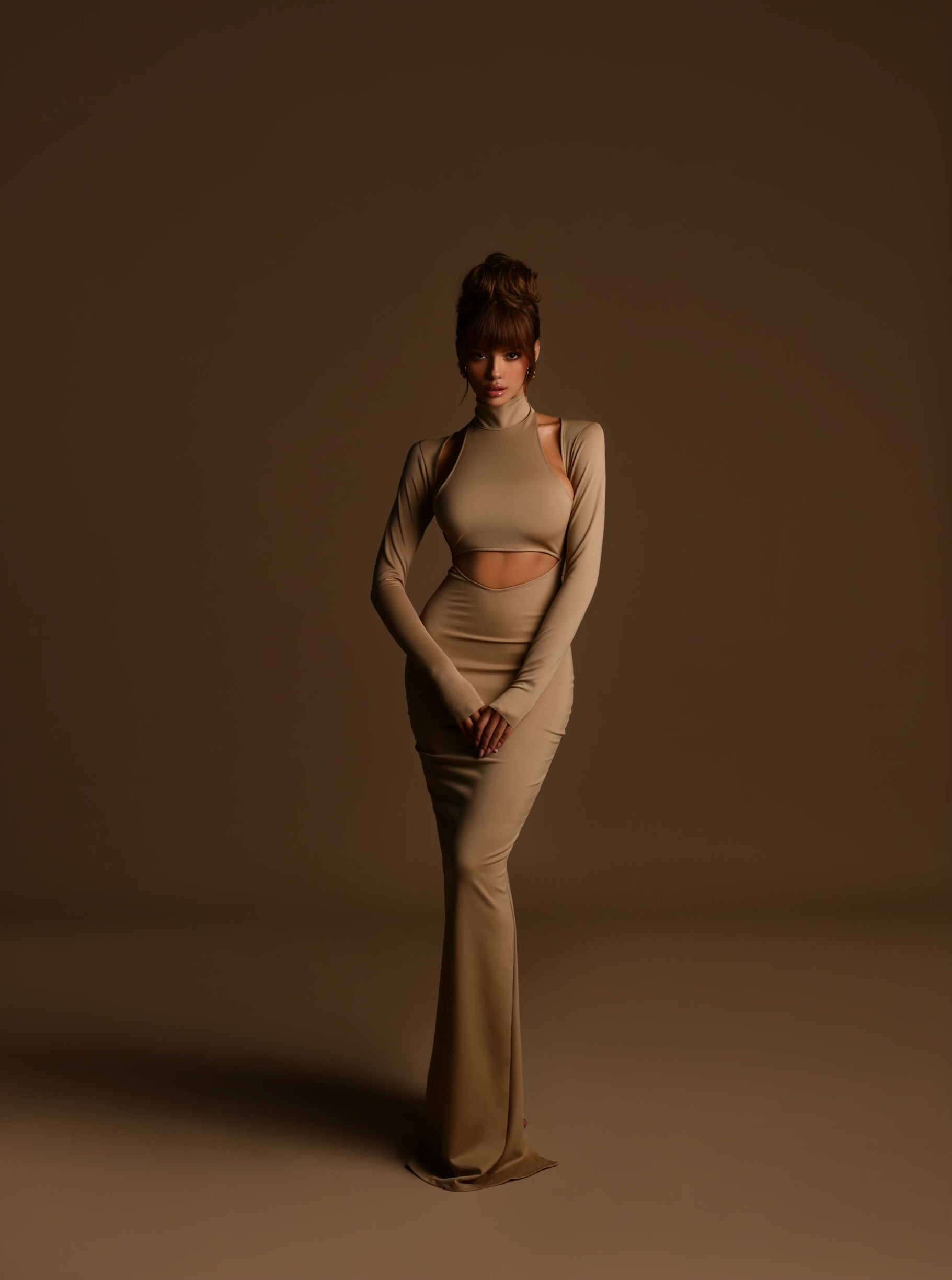 Long dress with turtleneck, long sleeve, open back and slit back.