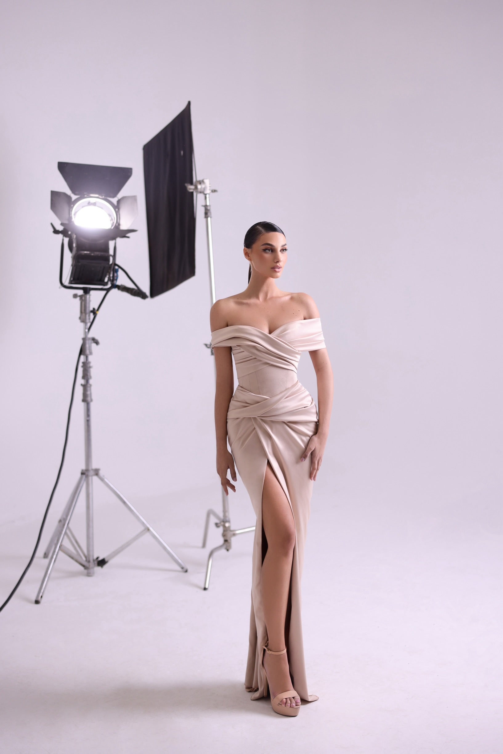 This soft nude satin dress features a corset-style bodice with delicate shoulder straps and cascading details. The high slit and drop details at the bottom add a touch of allure, creating a sophisticated, elegant look.