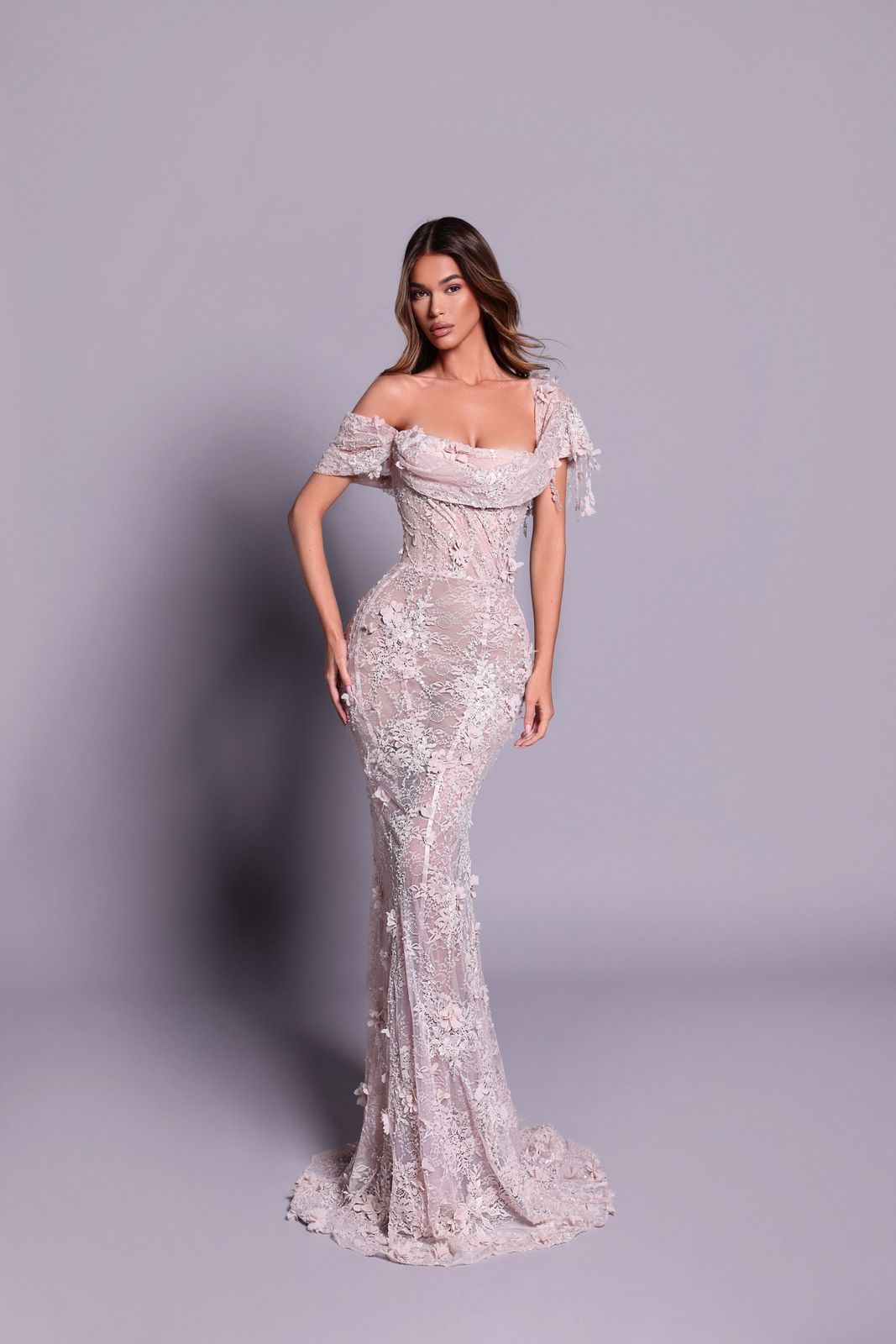 Ethereal and intricately crafted, the Maeve gown is a vision of romantic elegance. This off-the-shoulder masterpiece features a sculpted silhouette that hugs the body with impeccable precision, flaring subtly at the hem for a graceful finish. Adorned with delicate lace embroidery and shimmering beadwork, Maeve captures the essence of timeless glamour. Soft draping across the neckline and sleeves adds a touch of vintage romance, while the sheer overlay is embellished with floral appliqués that create a dimensional, enchanted effect. Perfect for evening galas or bridal elegance, Maeve is a dress that speaks in whispers of sophistication and allure.